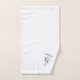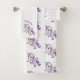 Sweet personalized girl's bathroom towel set featuring a colorful flying unicorn with purple ombre mane and tail and purple star accents. Personalize the purple name, on the washcloth to suit your needs.