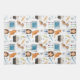 Destei's veterinary theme pattern featuring a female veterinarian with long brown hair, an orange cat, a brown and white puppy dog, a syringe with yellow liquid in it, colorful vials, thermometer, bandage, portable pet carrier box, X-ray of a dog's skeleton and bones, and some gray animal paw prints.