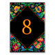 Add a festive decorative element to your reception with this colorful vibrant fiesta floral black wedding table number card. The elegant black background highlights bright colorful florals that create a vibrant botanical design inspired by joyful fiesta celebrations. This stylish table number helps guests easily locate their table while enhancing your colorful wedding decor.