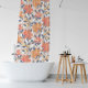This colorful floral patterned shower curtain features a vibrant orange and yellow botanical print with blue leaves, and coordinates with the pretty floral decor including pillowcases, duvet cover, curtains and area rug found in this shop.