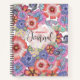 This personalized spiral notebook radiates creative beauty and a personal touch. The cover is a vivid canvas of highly crafted floral pattern that blooms in dazzling shades of red, pink, purple, and blue. The flowers are intertwined with delicate green foliage, creating an intricate botanical tapestry that is both visually delightful and captivating. The notebook features a black spiral binding on the left side, adding a modern touch to its traditional design. In the center of the cover, there's a white opaque area where "Catherine's Journal" is elegantly inscribed in cursive handwriting. This customizable space adds a personal touch, making it not just a notebook, but a personal journal that can capture one's thoughts, ideas, and memories.
