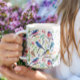 This charming coffee mug design showcases vibrant birds and playful flowers frolicking against a crisp white background. Ideal for those who appreciate nature's beauty, this mug is sure to make your morning coffee even more enjoyable.