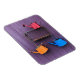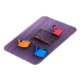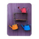 Cute & colorful watering cans against a purple painted wood panel wall. Very cute & creative garden decor!