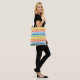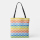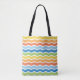 Yellow, orange, blue, green and white colors, a tote bag designed with a colorful wave pattern. Customize the tote bag pattern size among other options.