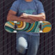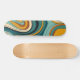 This skateboard features a captivating abstract pattern with yellow, blue, and orange colors, along with dark teal and dark beige accents. The colorful stylized design includes wavy lines and curves that create a vibrant and eye-catching look. Perfect for skaters who want to stand out and express their unique style on the streets.
