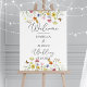 Welcome your wedding guests with this beautiful wildflower sign. Colorful flowers decorate the top and bottom while "Welcome" is written at the top in a lovely script. The newlywed's names along with the wedding date can be easily customized. It makes a great photo backdrop for your wedding reception and a keepsake for the newlyweds.