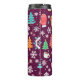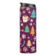 The image is a pattern of colorful Christmas-themed illustrations on a dark purple background. The illustrations include: Christmas trees in various colors and styles, some decorated with baubles, snowflakes in different sizes and shapes, scattered throughout the pattern, mittens with different knitted patterns in bright colors and mugs filled with steaming hot drinks, some with festive designs. The overall effect is cheerful, festive, and evocative of the winter holiday season.