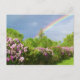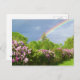 blooming lavender lilacs among lush green trees with a magical rainbow arching overhead