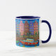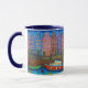 A vibrant and lively stylized night scene of Amsterdam's colorful, narrow houses along the canals on a mug by popular artist Lisa Lorenz©