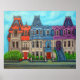 Vibrant, stylized painting of the colorful Victorian row houses on Saint-Louis Square in The Plateau district of Montreal, Quebec, by Lisa Lorenz