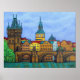 Vibrant, stylized painting of beautiful Prague and the Charles Bridge along the Vltava River in Prague, Czech Republic by Popular Artist Lisa Lorenz.