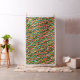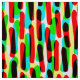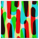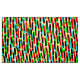A design made up of three different layers of hand drawn dashed strokes in three different colors which interact with each other creating additional colors. This pattern can be made larger or smaller.