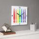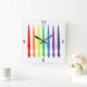 This modern square clock has a simple and elegant design of paintbrushes in rainbow colours (red, orange, yellow, green, blue, indigo and violet), with just four numbers; 12, 3, 6 and 9. The numbers are black and the clockface is white. It would look good in a craft room, on an art room wall, or in a modern setting.