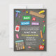 Encourage kids to look forward to the new school year with a back to school party! This colourful invitation has a grey chalkboard texture background and has many classroom elements filled around the invite. Things include, crayons, paper clips, pins, ruler, pencil, colouring pencils, apple with A+ on it, star stickers, glue, paint tube, paintbrush, calculator. Personalise easily with your party details!