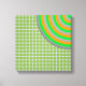 Customisable Colourful Concentric Circles Canvas with grey background below a second background of small tiled concentric circles an finally same concentric circle placed large, and cropped to reveal only one quarter of the circle, placed in the top right hand corner of the canvas. This canvas come as a set of four canvases, which together, will complete the large cropped circle.