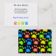 Simple graphic illustration of a cute animal paw print background design in red, yellow, green and blue. Image available on various gifts and products. Custom business cards.
