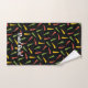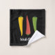 Red, yellow and green colour peppers. Custom background colour. Pepper icons on wash cloth. Seamless pattern on hand and bath towel. Custom text on all three towels.