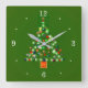 A green Christmas clock with a colourful tree with baubles in the centre. This traditional design also has white numerals.Available in square and round shapes.