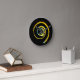 Wall clock with image an abstract image of a yellow twirl on black, on the face of the clock. Customisable.