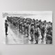 World War Two women in uniforms and gas masks lined up for inspection. Black and white public domain photo.