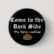 This comical button says 'Come to the Dark Side - We have cookies' in two fancy fonts. Just below the text is a plate of cookies to illustrate the cookies on offer for joining the dark side.