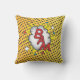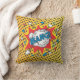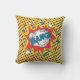 Fun pop art comic book inspired pillow with yellow background and black dots. One side is a explosion with Bang!, and the other side is a cloud burst with the word Bam! Hand drawn illustration by McBooboo
