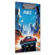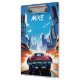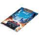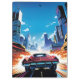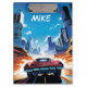 A comic book rendition of a sports car speeding along a highway towards a city. Bright colors, lots of action, totally fun design on this clipboard.