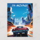 A comic book rendition of a sports car speeding along a highway towards a city. Bright colors, lots of action, totally fun design on this change of address postcard.