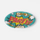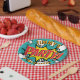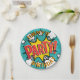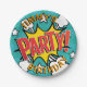 Party paper plates featuring a comic book style typography of 'PARTY!'. This include elements of blue, orange, yellow and red, comic book explosions, stars, and star burst backgrounds. Customize with persons name and event, or leave it blank.