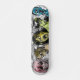 This skateboard features a comic book inspired collage of zombie illustrations in a horror rainbow of red and pink, beige, yellow, green and blue. These graphics have a distressed style for a creepy look.