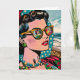 Blank card. Cool ai art depicting a woman kicking back at the beach on vacation watching a hula dancer. This is done in a comic book art style giving a pop art retro vibe.