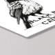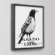 A bold black-and-white comic-style illustration of a bird standing upright with its head tilted back and beak wide open, as if calling out or cawing loudly. The design uses strong contrast, thick ink lines, and minimal shading to create a dramatic, expressive look. The pose captures motion and sound visually, with a stylized, graphic-novel feel that emphasizes energy and attitude.