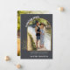 Custom photo birth announcement in gender neutral grey, winter white and gold. The photo template is set up for you to add 2 photos - one on the front, which is framed in a gold arch with fine sketched foliage and, one full bleed portrait photo on the back. "coming soon" is lettered in bold, arched typography and the remainder of the wording is fully editable for you to customize with your personalized message, baby due date and name(s). A chic, modern design to share the wonderful news of your pregnancy.