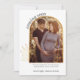 Custom photo birth announcement in gender neutral grey and gold. The photo template is set up for you to add 2 photos - one on the front, which is framed in a gold arch with fine sketched foliage and, one full bleed portrait photo on the back. "coming soon" is lettered in bold, arched typography and the remainder of the wording is fully editable for you to customize with your personalized message, baby due date and name(s). A chic, modern design to share the wonderful news of your pregnancy.