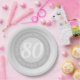 Commemorative birthday celebration paper party plate with person's name, and the date of their birthday. A paper party plate for someone who is 80.