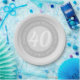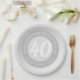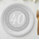 Commemorative birthday celebration paper party plate with person's name, and the date of their birthday. A paper party plate for someone who is 40.