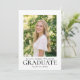 A classic graduation commencement invitation featuring a custom photo and traditional typography. This elegant design presents a formal, minimalist layout and timeless sense of style. You can personalize the template with the graduate's photo, name, parents' names, qualification title, educational institution, graduation year, and ceremony details. Printing colors: black and white, or customize the color to match your university, school, or college. Available as a printed card or a digital download.