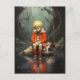 A young boy in a red jacket sits on a rock by a quiet, reflective water body, accompanied by his dog. The boy seems saddened and his faithful companion is commiserating with him. The scene is set in a mystical forest with a tranquil ambiance.