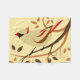 Stylized bird art of a female Northern Cardinal perched on decorative swirl branches and surrounded by leaves in fall colors
