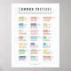 This colorful poster features some of the most common prefixes in the English language. Each prefix is shown with a definition and several example words.