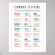 This colorful poster features some of the most common suffixes in the English language. Each Suffix is shown with a definition and several examples words.