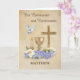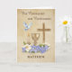 Celebrate a meaningful step in faith with this elegant Communion and Confirmation card, personalized with the recipient’s name on the front. Featuring a beautiful arrangement of Christian symbols—including a cross, chalice, candle and dove—this design reflects the sacred significance of these holy sacraments. A soft tan background with subtle texture adds warmth and grace, making it a cherished keepsake. Inside, a heartfelt message offers blessings and congratulations, perfect for commemorating this special occasion.