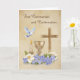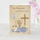 This elegant card celebrates the sacred sacraments of First Holy Communion and Confirmation with a beautifully symbolic design. A cross, chalice, candle, and dove are thoughtfully arranged with delicate florals at the base, representing faith, the Holy Spirit, and the journey of Christian initiation. Set against a soft tan background with a subtle textured look, the artwork conveys warmth and reverence. Inside, a heartfelt message offers blessings and congratulations, making this a meaningful keepsake for those receiving these holy sacraments.