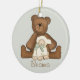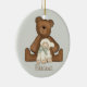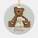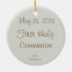 First Holy Communion keepsake ornament with teddy bear and lamb on soft green background.