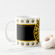 Mug white 11 oz. with black, gold and white concentric-circles design above a black and gold rectangle with "COLUMBIA, MISSOURI CENTER OF THE UNIIVERSE" "Columbia, MO GO TIGERS!!!" with Y-NOT-ME logos in the background. This design is a shout-out to Columbia, Missouri a city of champions.
