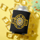 Can Cooler black with black, gold and white concentric-circles design above a black and gold rectangle with "COLUMBIA, MISSOURI CENTER OF THE UNIIVERSE" with Y-NOT-ME. This design is a shout-out to Columbia, Missouri a city of champions.