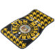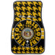 Car Floor Mat black with gold hounds-tooth design on the front and black, white, gold concentric-circles design and "FULTON, MISSOURI CENTER OF THE UNIVERSE" and the Great Seal of Missouri in the center and "FULTON, MISSOURI" at the top in script with Y-NOT-ME logo and black. This design is a shout-out to Fulton, Missouri, a great place to live.
