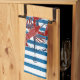 Bright blue and white horizontal pattern design kitchen towel features a nautical ocean theme with a ship's compass and a lobster.