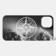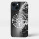 Compass star with black and white photograph of dramatic snowy mountains with milky clouds. With emblems wanderlust, nature, travel and explore that are customizable so you can write your own texts. In the centre of the star is a personalized monogram. Perfect for nature lovers hikers and travellers.