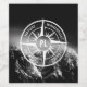 Compass star with black and white photograph of dramatic snowy mountains with milky clouds. With emblems wanderlust, nature, travel and explore that are customizable so you can write your own texts. In the centre of the star is a personalized monogram. Perfect for nature lovers hikers and travellers.